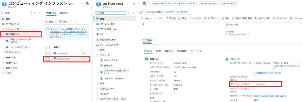 「仮想マシン」→「対象仮想マシン」→「プライベートIPアドレス」を確認いたします。