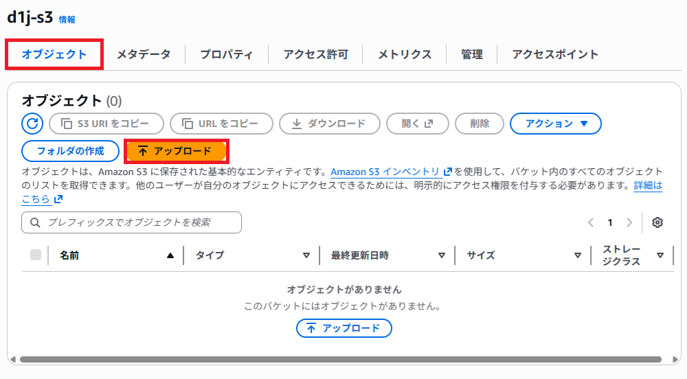 3. 「オブジェクト」をクリックし「アップロード」をクリックする。