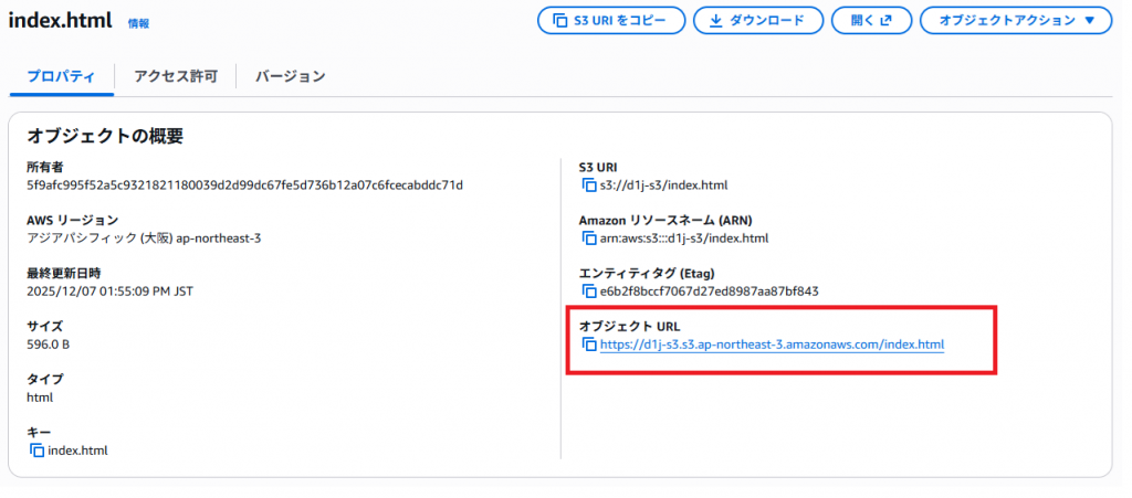 5. index.htmlをクリックし「オブジェクト URL」を確認いたします。