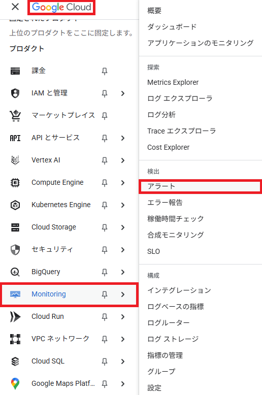 1. 左上の「≡」をクリックし「Monitoring」を選択し「アラート」をクリックする。