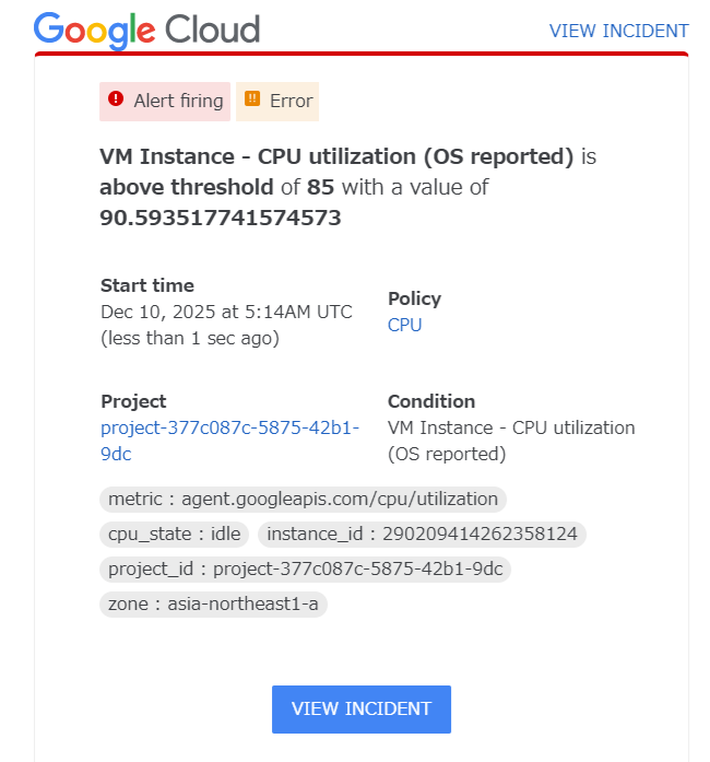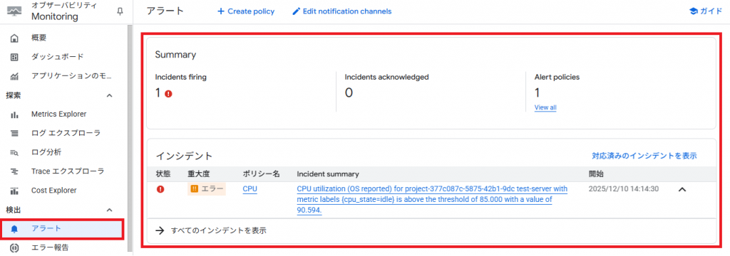 以上で「GCP(Google Cloud)Cloud Monitoring CPU使用率アラート設定方法(その3)」を完了いたします。