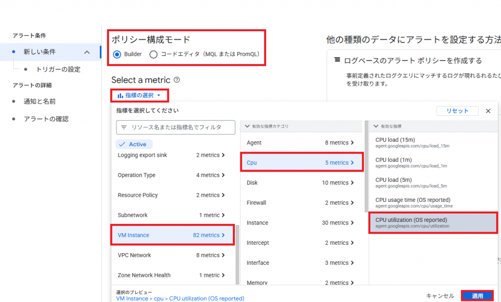 | Select a metric | 「指標の選択」をクリックし「VM Instance」をクリック、「Cpu」をクリック、 「CPU Utilization」をクリックする。 |