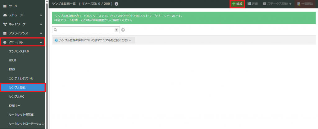 1.「グローバル」を選択し「シンプル監視」をクリックする。
