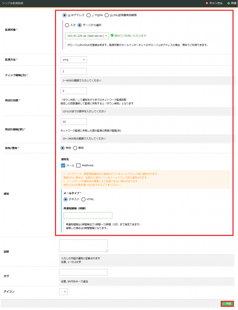 | 監視対象 | 「IPアドレス」を選択してください。 「サーバーから選択」を選択してください。 ※作成したサーバーを選択してください。 |