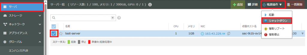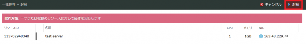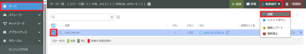 「電源操作」をクリックし「起動」をクリックする。
