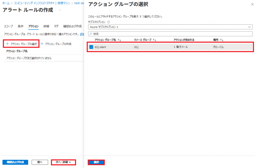 さきほど作成したアクショングループ名を選択し「選択」をクリックする。