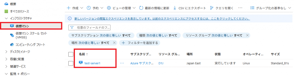 2. 「仮想マシン」をクリックし対象サーバーの「名前」をクリックする。