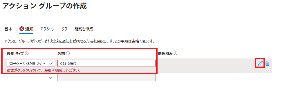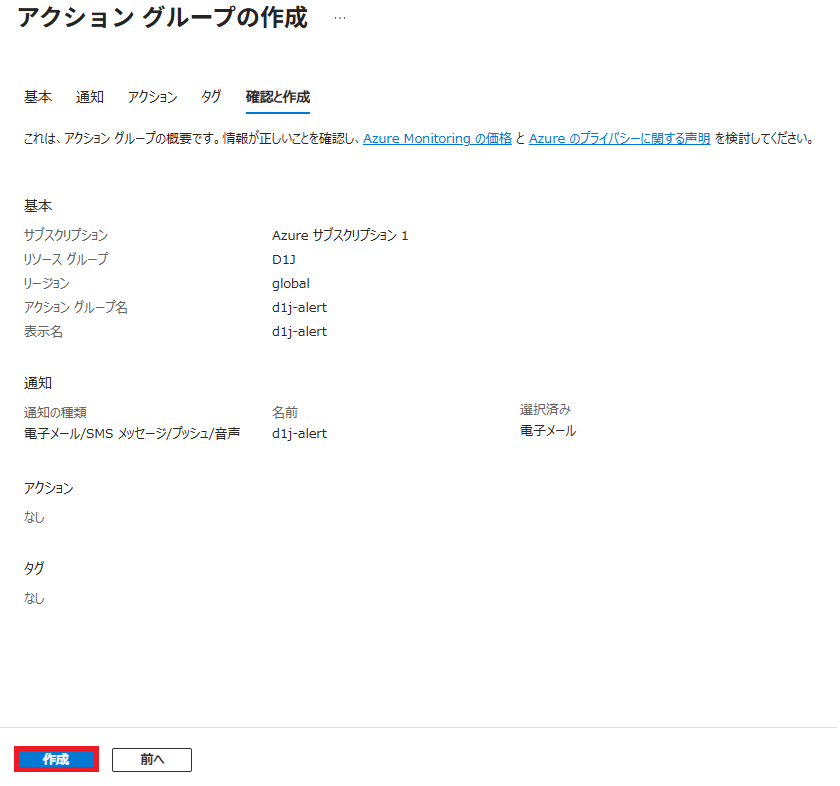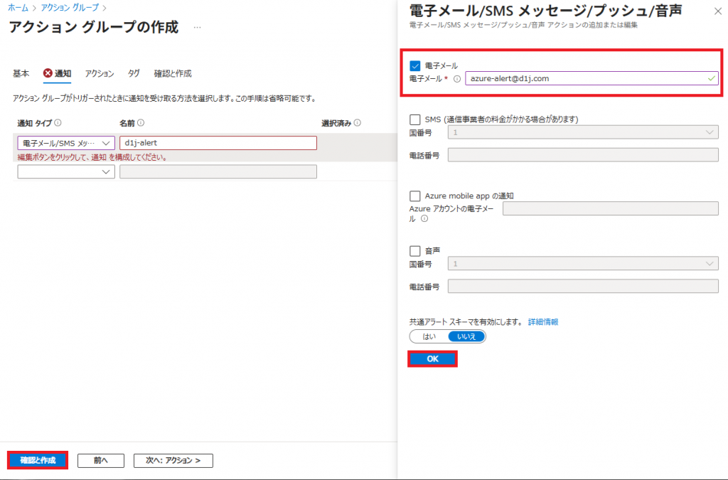 電子メールを入力し「OK」をクリックし「確認と作成」をクリックする。
