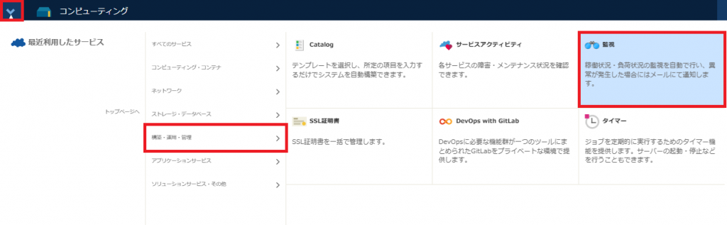 1. 左上のクリックして「構築・運用・管理」を選択して「監視」をクリックする。