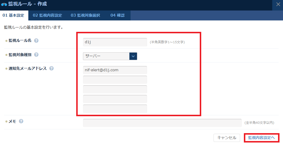 3. 入力、選択し「監視内容設定」をクリックする。