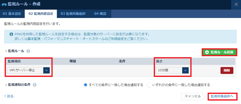 4. 「監視ルール追加」をクリックし、選択し「監視対象選択へ」をクリックする。