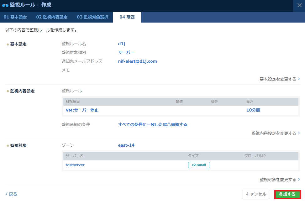 以上で「ニフクラ(FJcloud-V) サーバー停止 監視設定方法」を完了いたします。