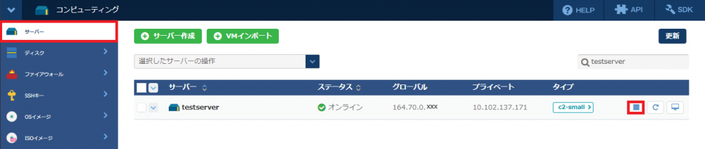 対象サーバーの「■」をクリックする。
