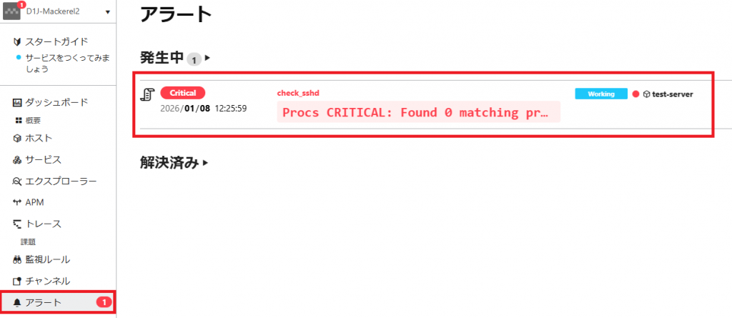 4. Mackerelの管理画面から「アラート」をクリックする。