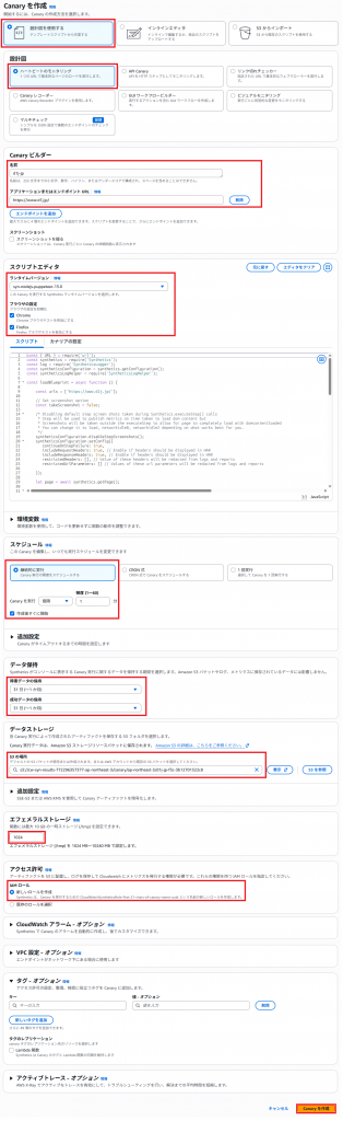 | Canaryを実行 | 「間隔」「1」分に入力してください。 作成後すぐに開始にチェックマークを入れてください。 |