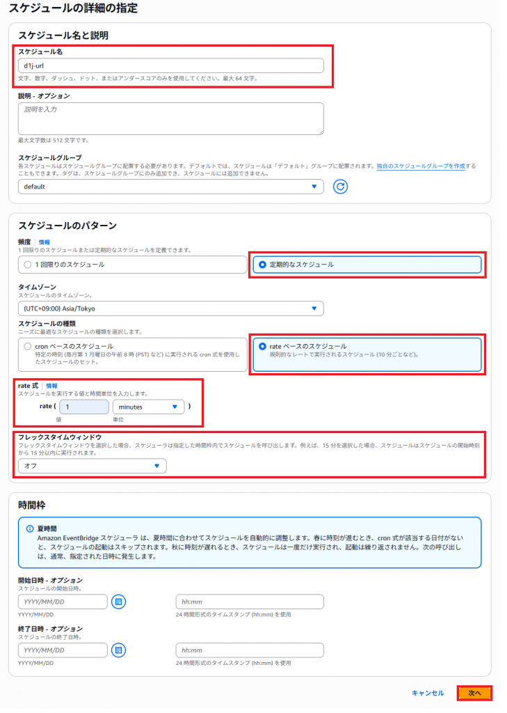 | rate式 | 「1」を入力してください。 「minutes」を選択してください。 ※1分間1回実行することになります。 |