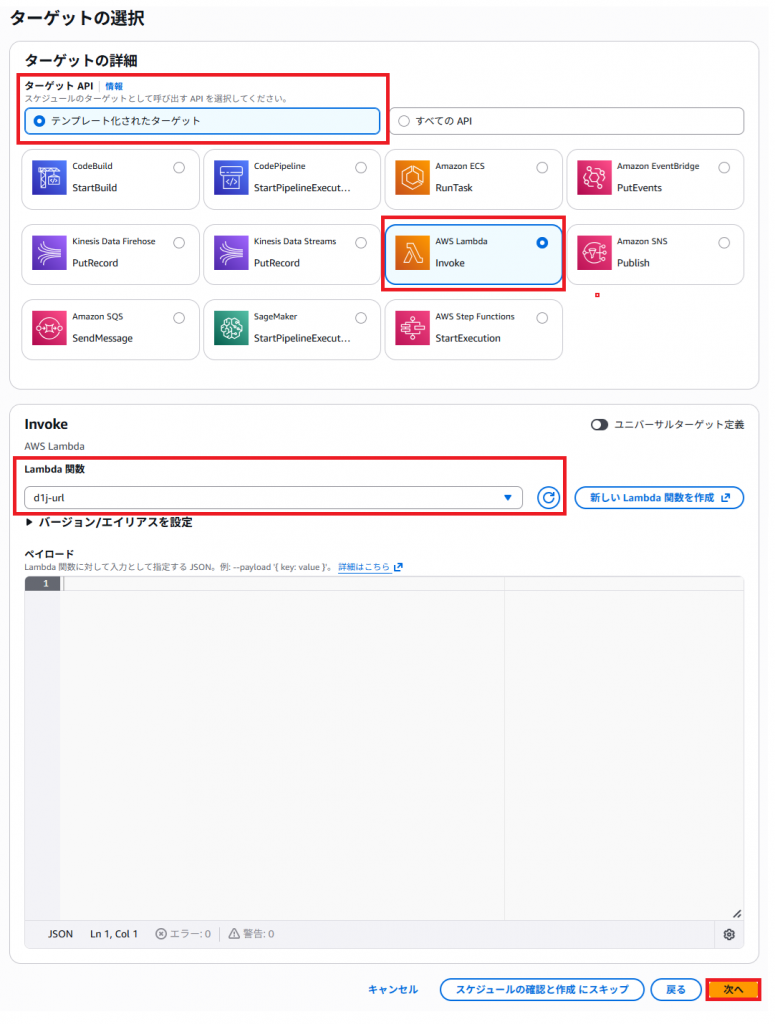| ターゲットAPI | 「テンプレート化されたターゲット」を選択してください。 「AWS Lambda Invoke」を選択してください。 |