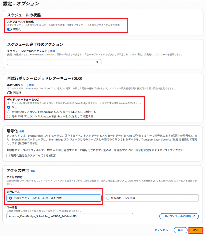 | アクセス許可 | 「このスケジュールの新しいロールを作成」を選択してください。 |