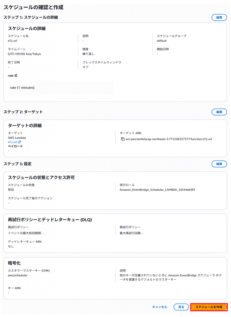 EventBridgeを利用してLambdaで作成したURL監視は1分間1回のスケジュールを設定いたします。