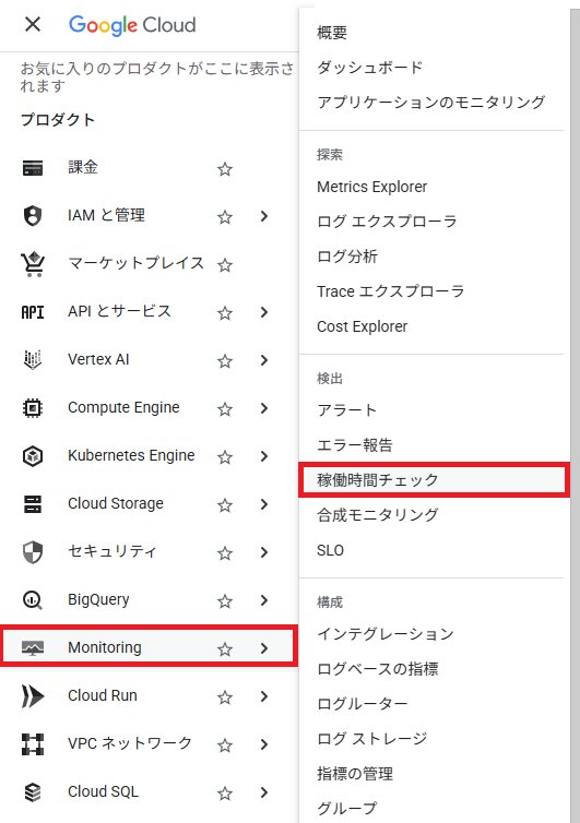 1. 左上の「≡」をクリックし「Monitoring」を選択し「稼働時間チェック」をクリックする。