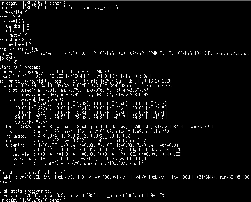 | 書き込み clat (usec): min=2040, max=87390, avg=9968.58, stdev=20307.53 lat (usec): min=2067, max=87420, avg=9999.34, stdev=20305.92 iops : min= 96, max= 106, avg=100.07, stdev= 1.89, samples=59 WRITE: bw=100.0MiB/s (105MB/s), 100.0MiB/s-100.0MiB/s (105MB/s-105MB/s), io=3000MiB (3146MB), run=30008-30008msec | ・レイテンシ:約10 ms ・IOPS:約99 ・帯域:約100 MiB/s(約105 MB/s) ・帯域(MB/s)は 大きいほど良い |