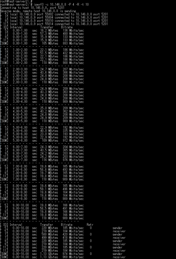 | [ ID] Interval Transfer Bitrate Retr [ 5] 0.00-10.00 sec 220 MBytes 185 Mbits/sec 0 sender [ 5] 0.00-10.00 sec 219 MBytes 184 Mbits/sec receiver [ 7] 0.00-10.00 sec 500 MBytes 420 Mbits/sec 0 sender [ 7] 0.00-10.00 sec 499 MBytes 418 Mbits/sec receiver [ 9] 0.00-10.00 sec 220 MBytes 185 Mbits/sec 0 sender [ 9] 0.00-10.00 sec 219 MBytes 184 Mbits/sec receiver [ 11] 0.00-10.00 sec 220 MBytes 185 Mbits/sec 0 sender [ 11] 0.00-10.00 sec 219 MBytes 184 Mbits/sec receiver [SUM] 0.00-10.00 sec 1.13 GBytes 974 Mbits/sec 0 sender [SUM] 0.00-10.00 sec 1.13 GBytes 969 Mbits/sec receiver | ・帯域 974Mbps ・Retr(再送)0 |