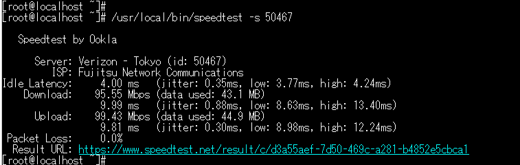 | # /usr/local/bin/speedtest -s 50467 | speedtestを起動して調査いたします。 1回目は以下の表示がでます。YESしてください。 Do you accept the license? [type YES to accept]: YES |
