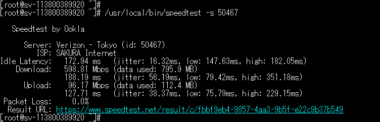 | # /usr/local/bin/speedtest -s 50467 | speedtestを起動して調査いたします。 1回目は以下の表示がでます。YESしてください。 Do you accept the license? [type YES to accept]: YES |