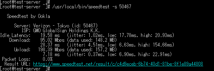 | # /usr/local/bin/speedtest -s 50467 | speedtestを起動して調査いたします。 1回目は以下の表示がでます。YESしてください。 Do you accept the license? [type YES to accept]: YES |