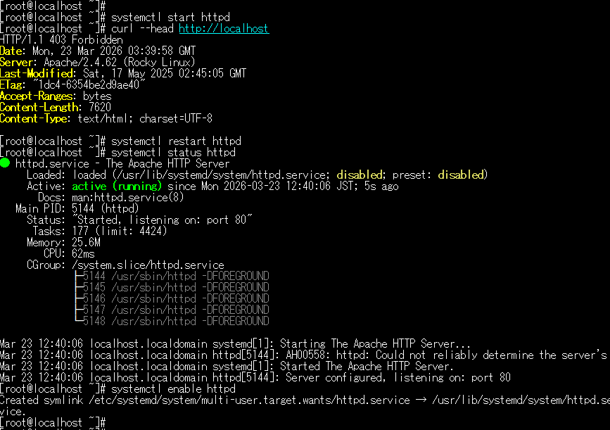 | # systemctl restart httpd | Apacheをリスタートしてみます。 |