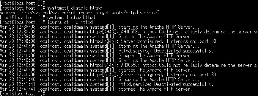 | # journalctl -u httpd | 最後にApacheログを参照いたします。 |