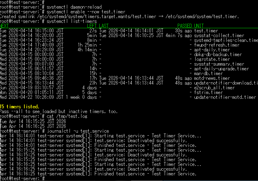 | # systemctl enable --now test.timer | タイマーを有効化・起動いたします。 サーバー再起動時も自動起動いたします。 |
